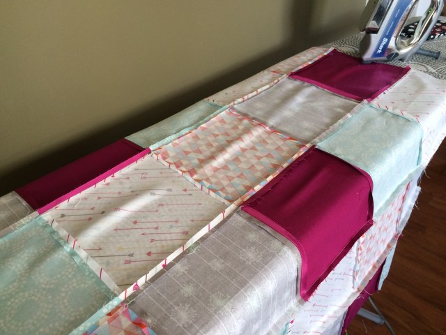Finally, I was ready to put all 30 squares tougher. In my “filler” bag were pieces that she asked for me to use as much as possible throughout the quilt, so I decided to make bands to run horizontally across the quilt between each of my rows.
