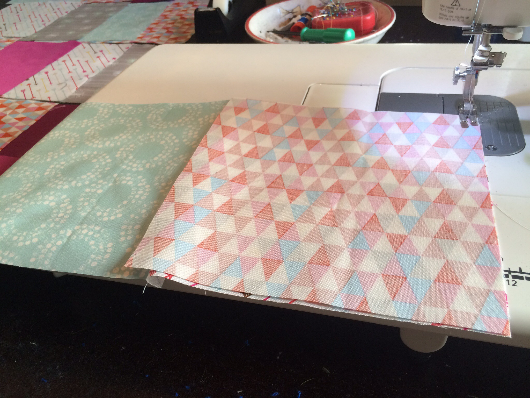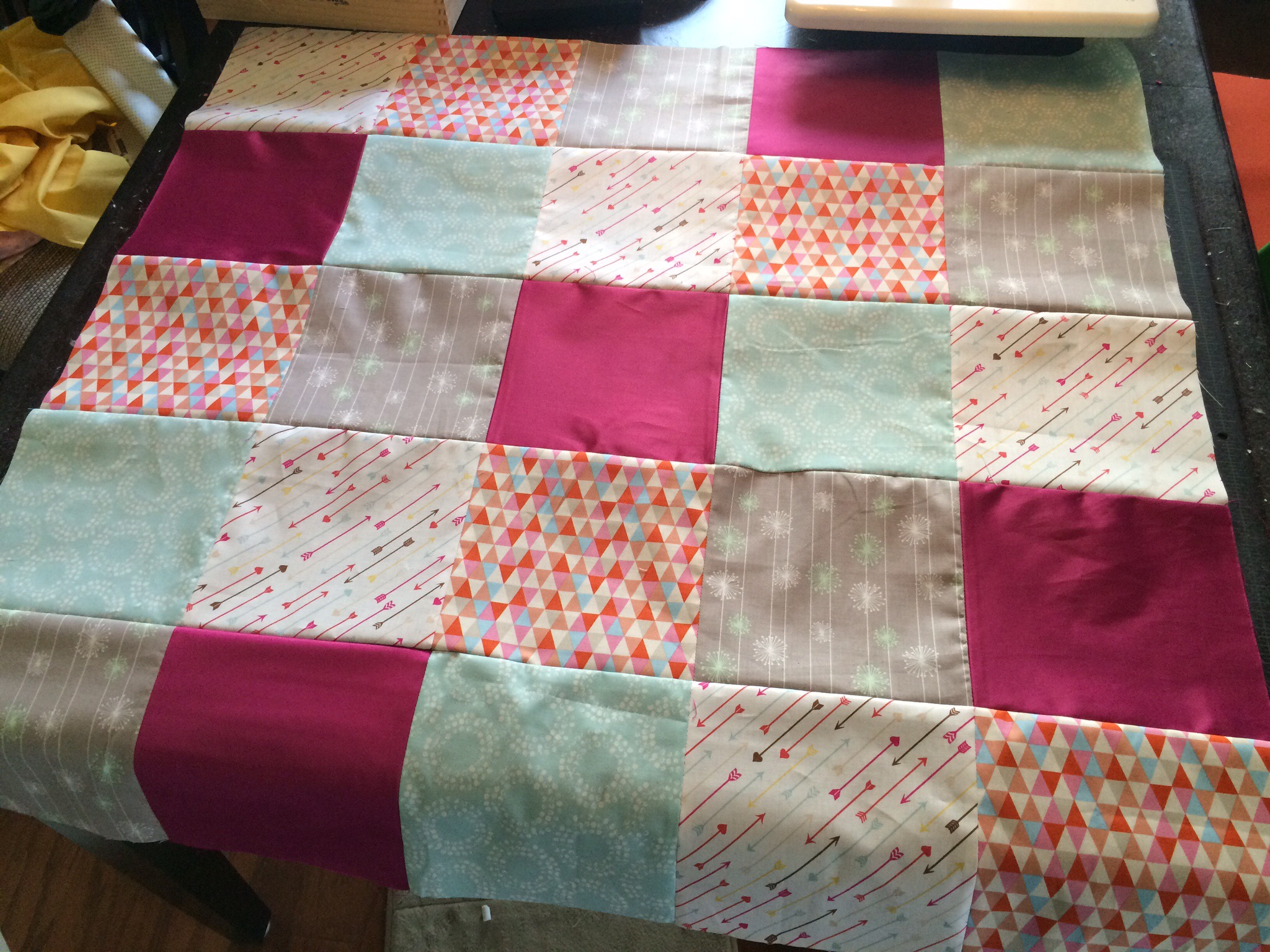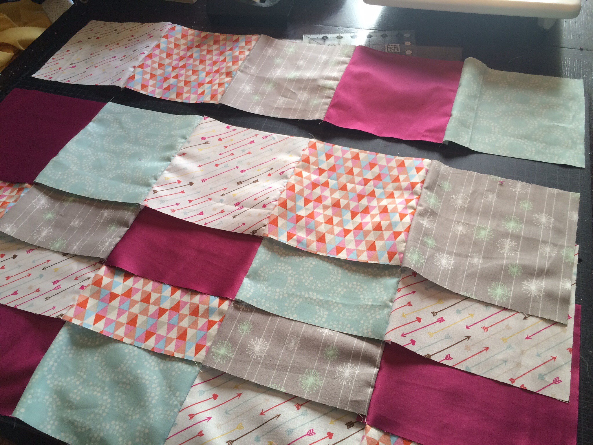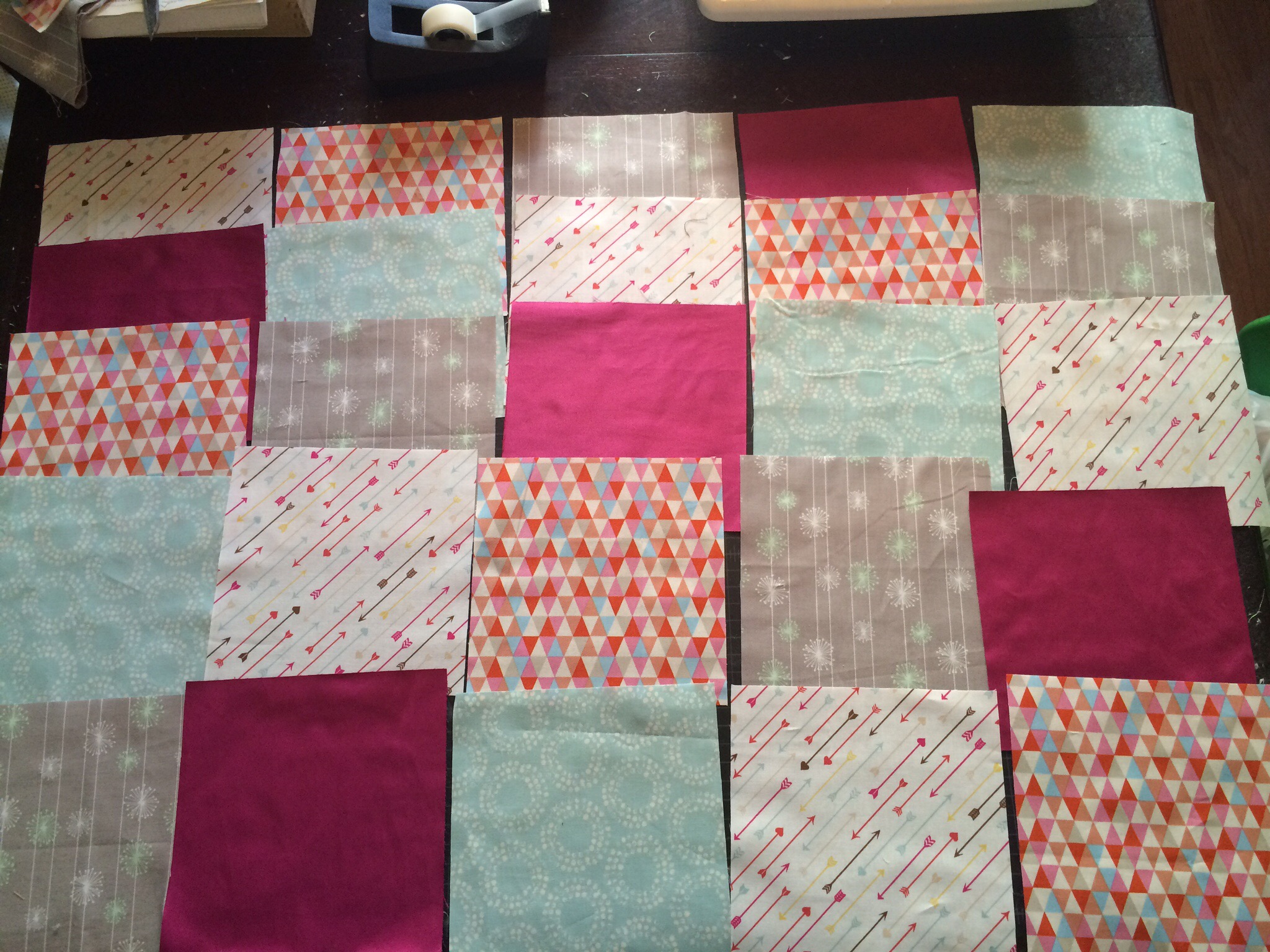Finally, I was ready to put all 30 squares tougher. In my “filler” bag were pieces that she asked for me to use as much as possible throughout the quilt, so I decided to make bands to run horizontally across the quilt between each of my rows.