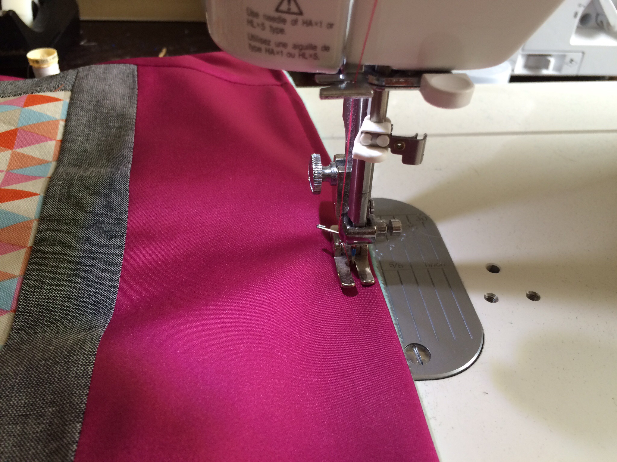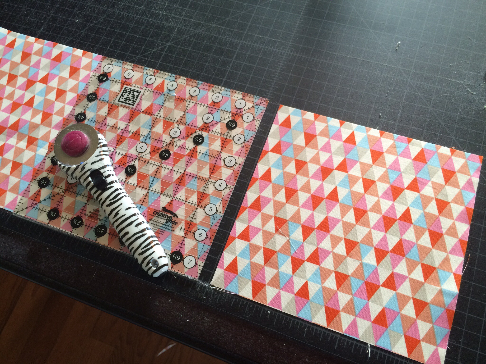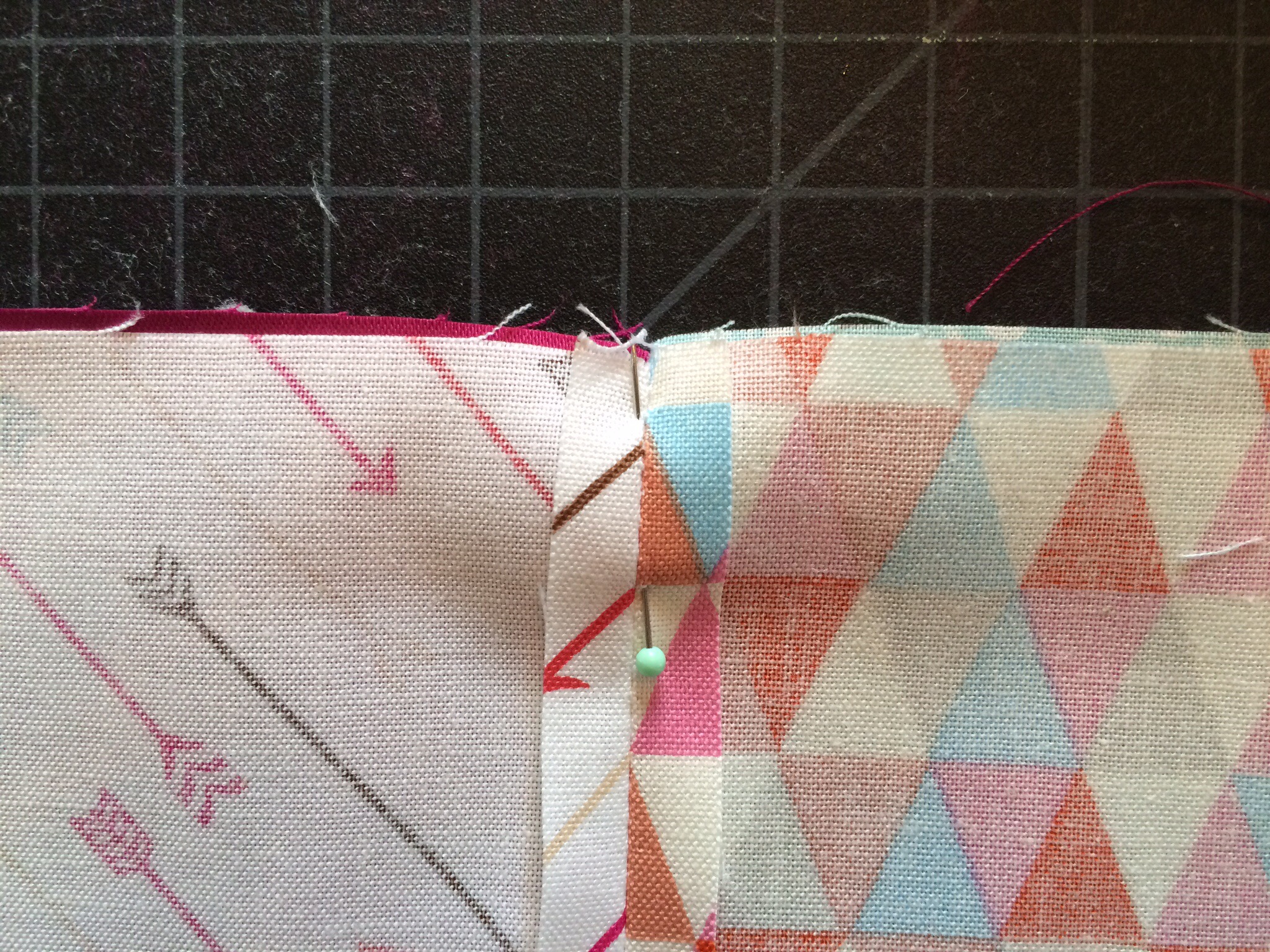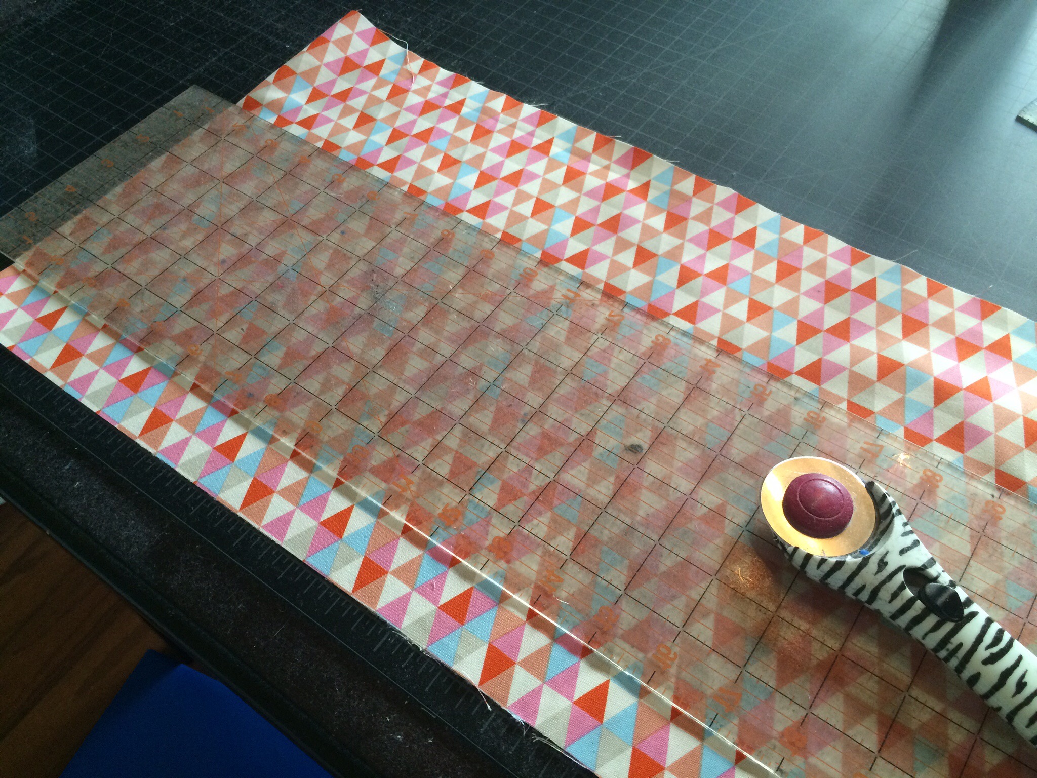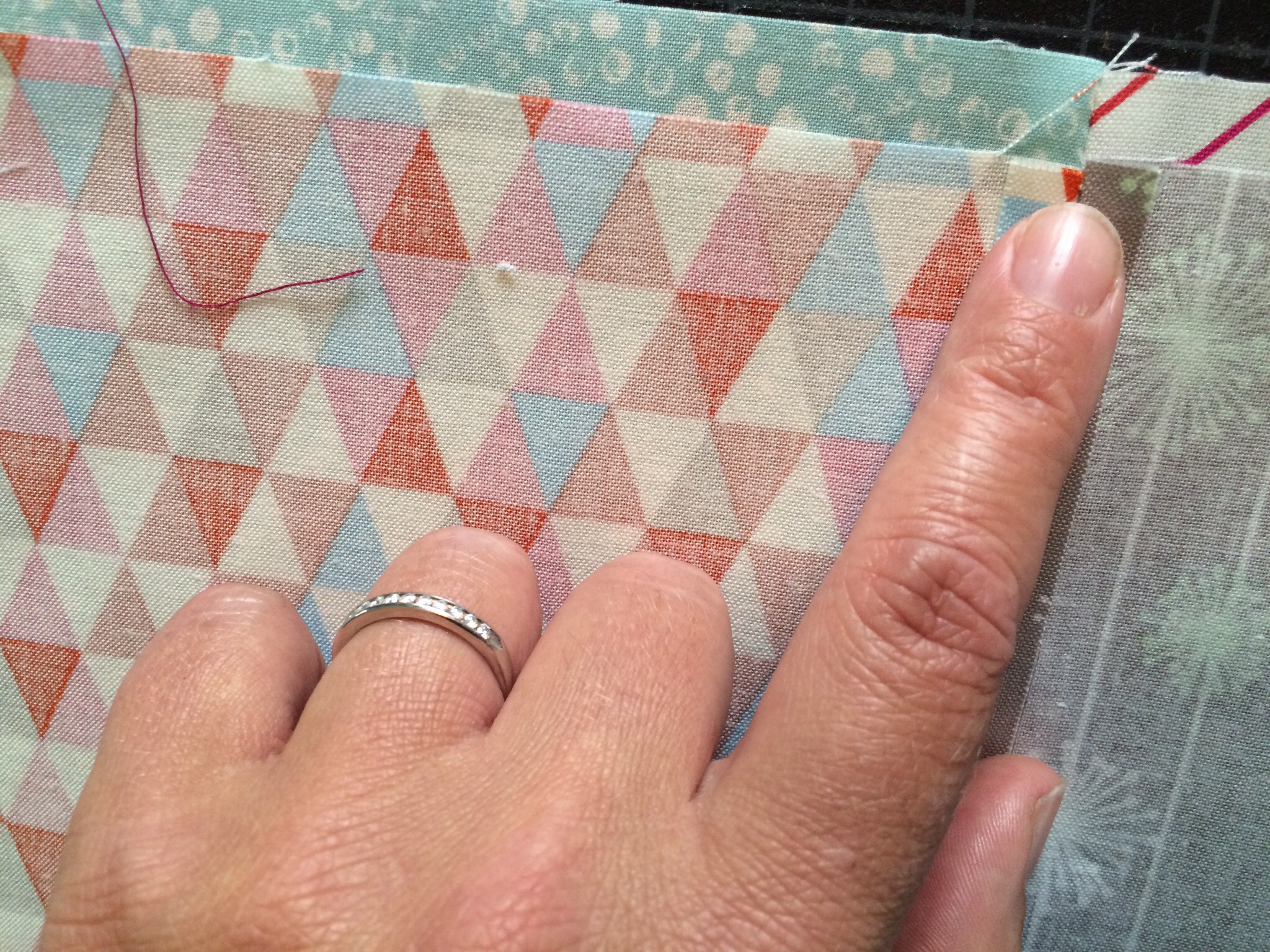 Finally, I was ready to put all 30 squares tougher. In my “filler” bag were pieces that she asked for me to use as much as possible throughout the quilt, so I decided to make bands to run horizontally across the quilt between each of my rows.