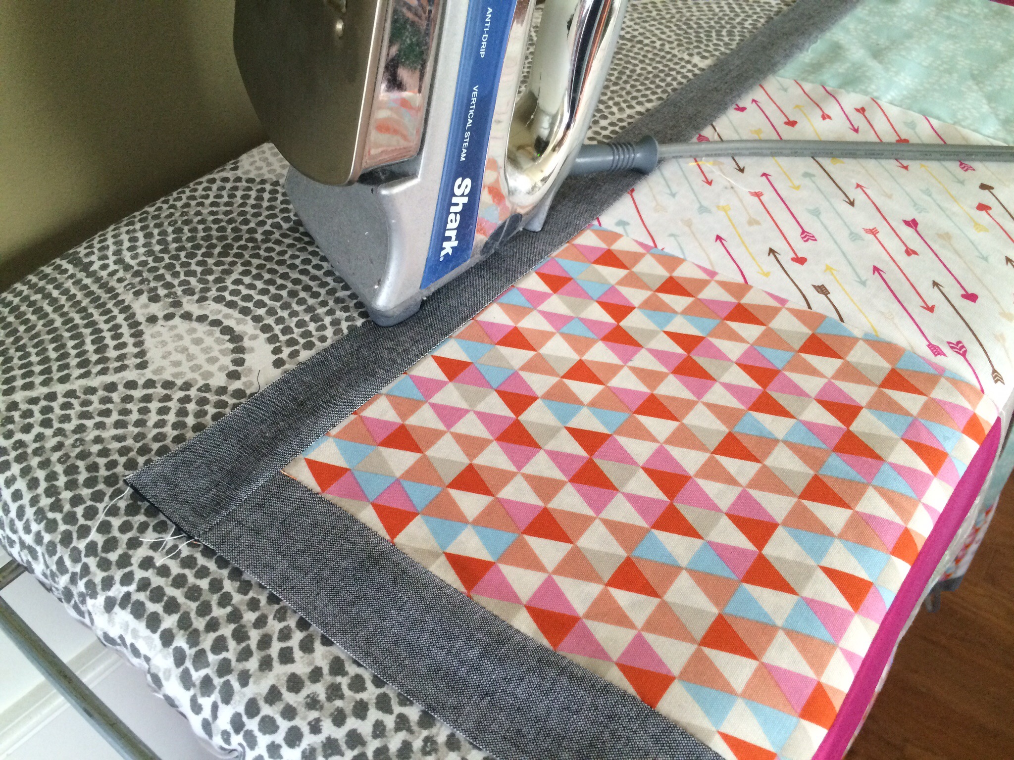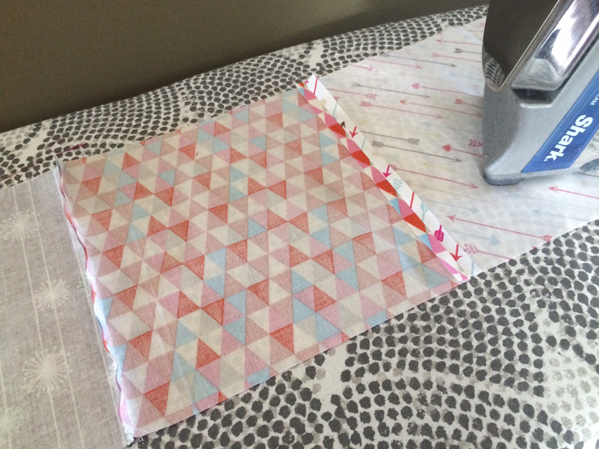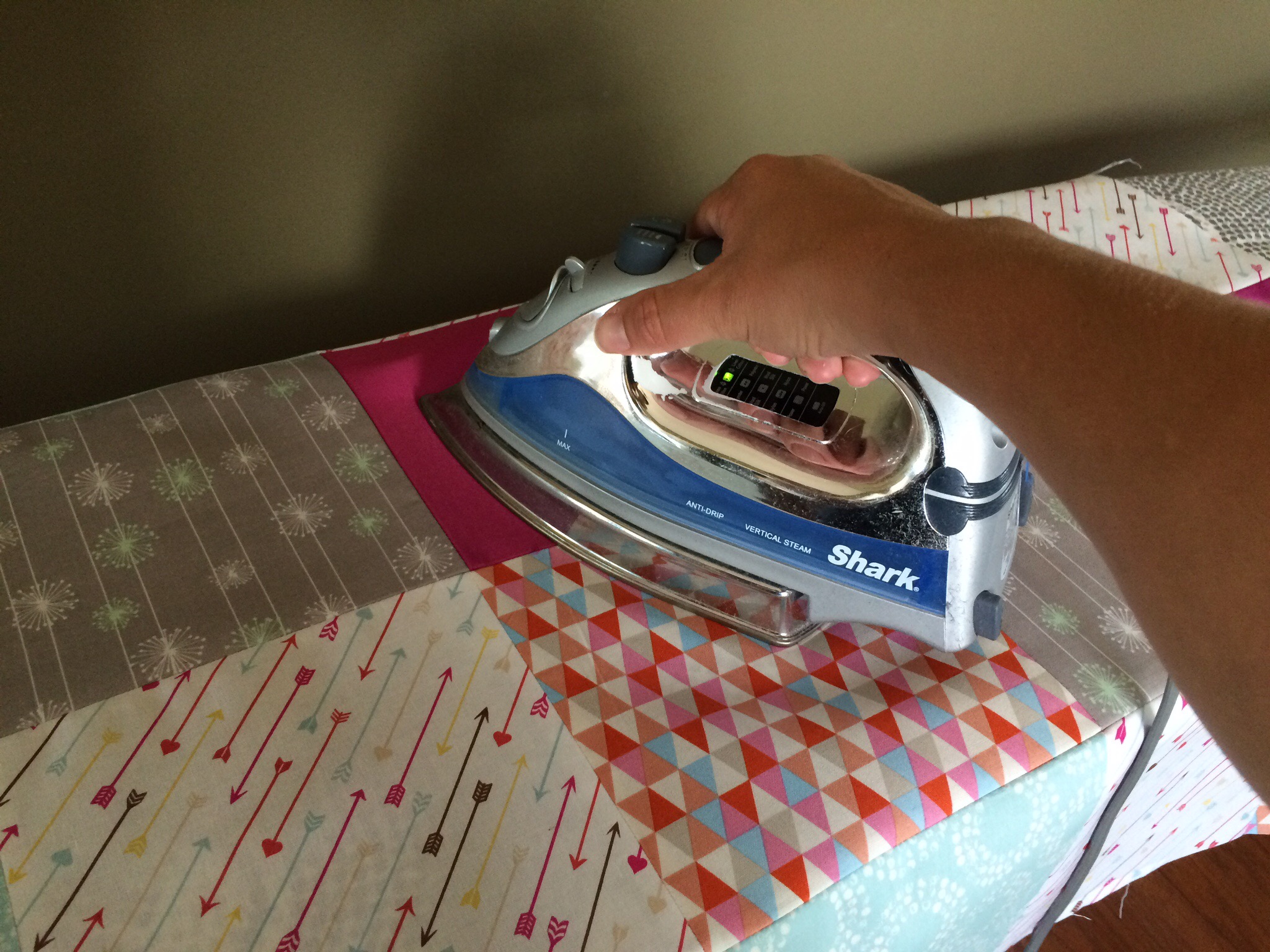 I was still unsure how I was going to make it all come together, but went ahead and ironed the stabilizer on the back of the knit shirts. While I was ironing (and ironing, and ironing), I had the idea to create squares. Usually, I cut my t-shirts for quilts into 15″ squares. Since I had way too many shirts to do that, I would use multiple shirts to make up a 15″ square. Then, sew all my squares together for the finished quilt.
