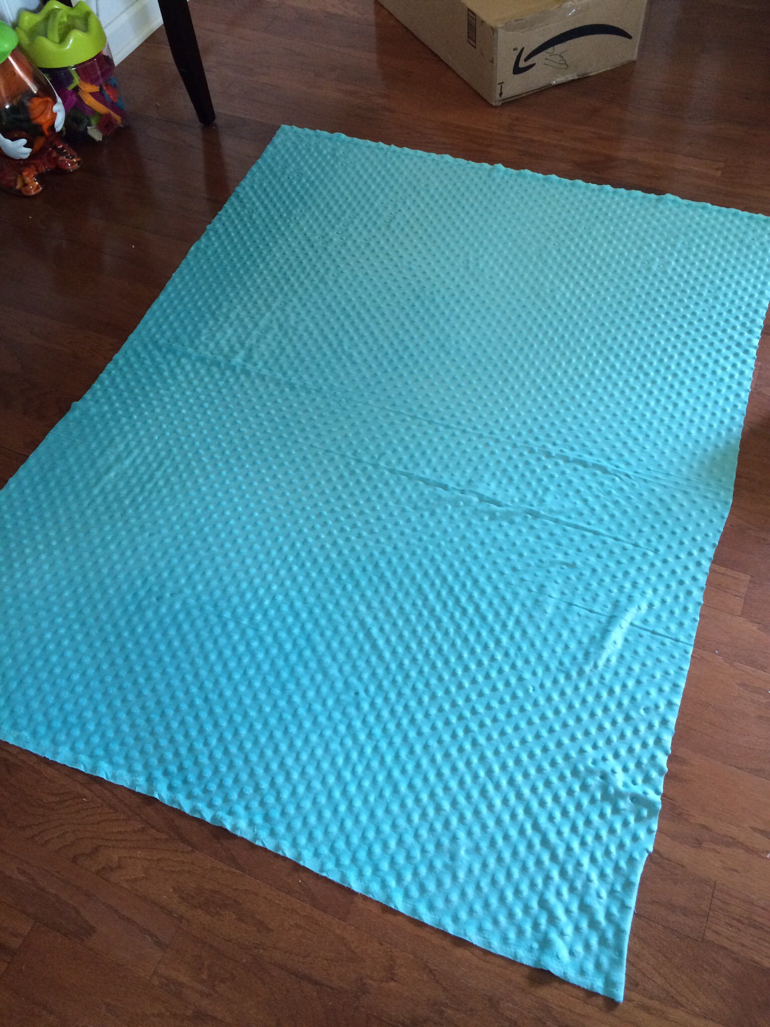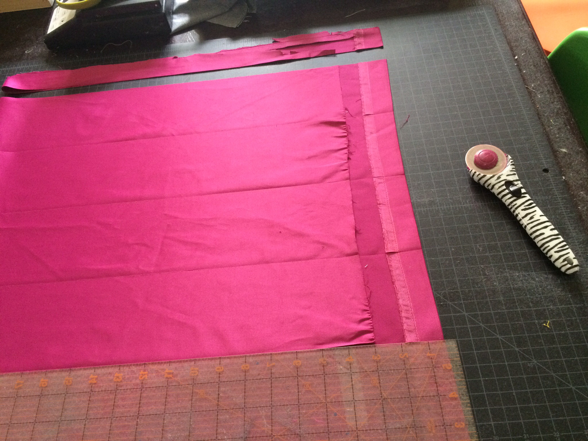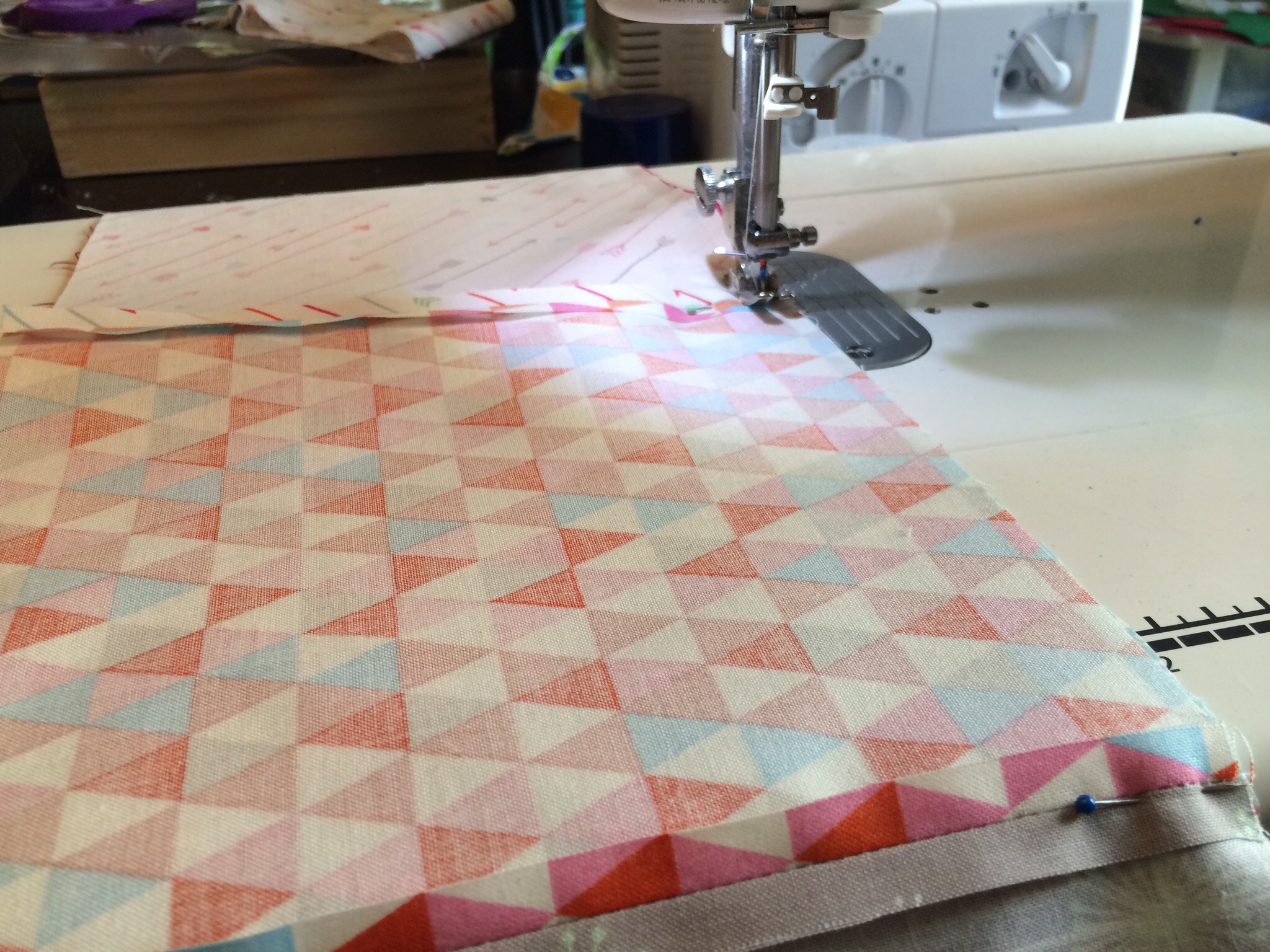 First, I cut the shirts so they were square (or rectangle). I had a whole box of stuff that I called “filler”, and decided to use those to fill in the gaps. Here you can see some of the shirts cut, and how I started to fill in to make squares.