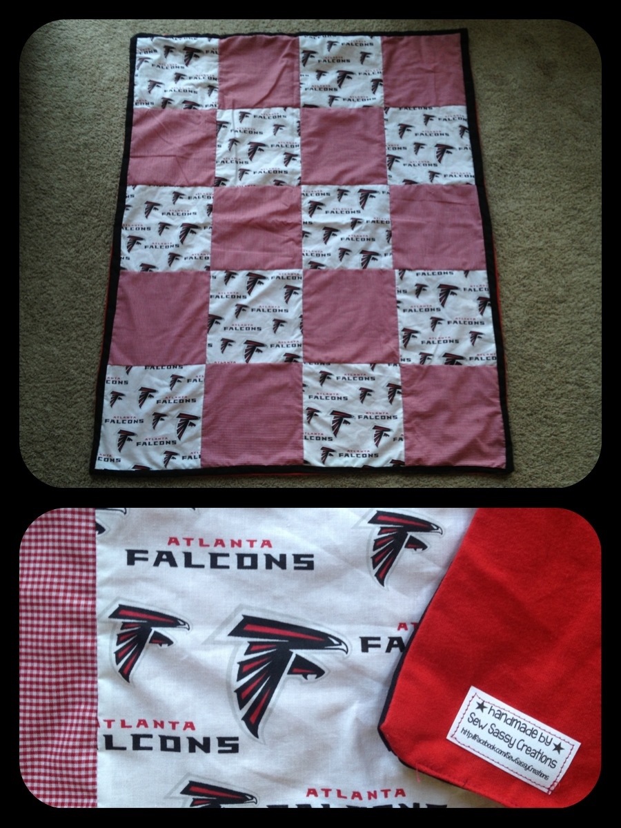 In the mean time, I was at Hobby Lobby (for what, I’m not even sure), and browsed through the fabrics. I saw they had Atlanta Falcons fabric, and got an idea. My best friend and her husband are Falcons season ticket holders. Their daughter was turning 1, and I needed a birthday gift. I bought the fabric along with red gingham and red flannel to back the blanket, went home and got straight to work.