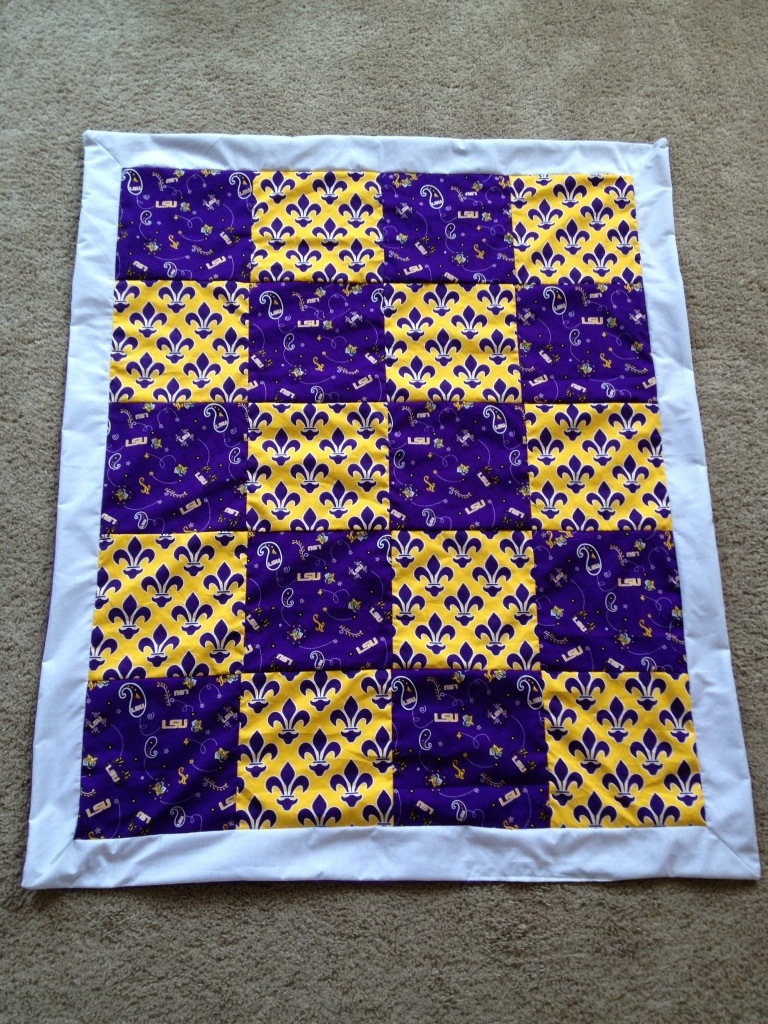 After these blankets were finished, I had the opportunity to create a LSU blanket for a friend’s little girl. Normally, I either purchase fabric from Jo Ann’s or Hobby Lobby, or I order from Fabric.com, but none of these had the purple LSU fabric that I wanted. I found it online, but (of course) had issues actually getting it. 2 weeks, 3 emails, and 2 separate shipments later… Here it is-