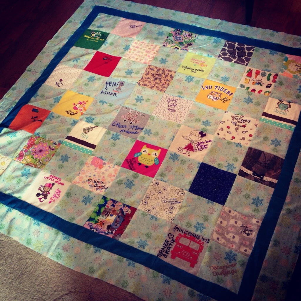 I am so excited about this quilt. It is an adult size blanket, using baby onesies. 32 onesies to be exact, that came from 30 awesome women (plus myself). The story behind this quilt began over 2 years ago…