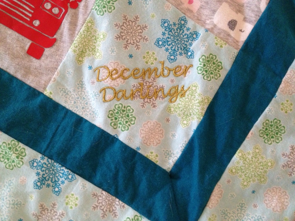 If you read through this, thank you! For those here for the quilt, this blanket consists of 32 onesies and 32 flannel squares, each measuring 7″. The teal border is 2.5″ and the snowflake border is 4″. The finished blanket measures 69″ square, and its backed with pale grey anti-pill fleece. We plan to “share” this blanket, sending it to those in need when they need it. I’m hoping nobody “needs” it soon because I’m not ready to part with it.