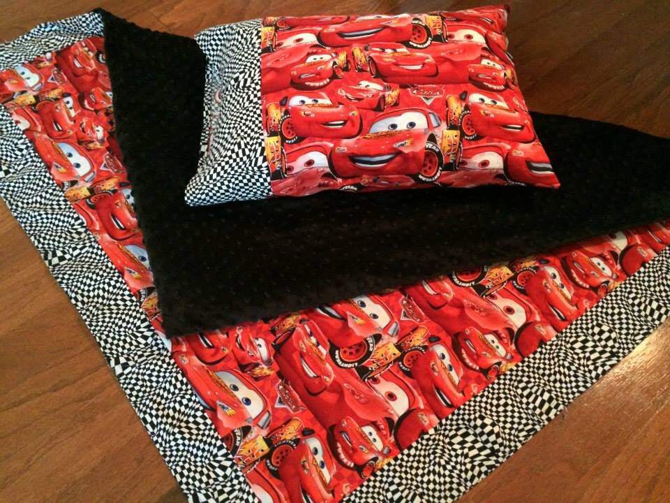 Once your front is done, it’s time to attach the back. I used minky dot fleece for this quilt. This fabric sheds. A lot. It’s also sometimes almost slippery to work with. Use lots of pins and sew slowly. To attach the front to the back, lay your fleece down on floor, good side up.