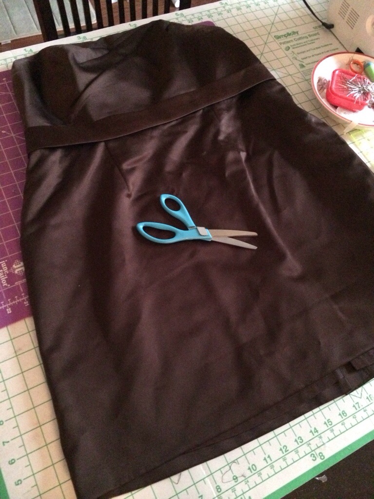 When it comes to cutting the dress, don’t be afraid. Cut along the seams to give yourself large panels to work with. Do just like you did before and cut a 6.5″ strip and then use the quilting ruler to cut squares.