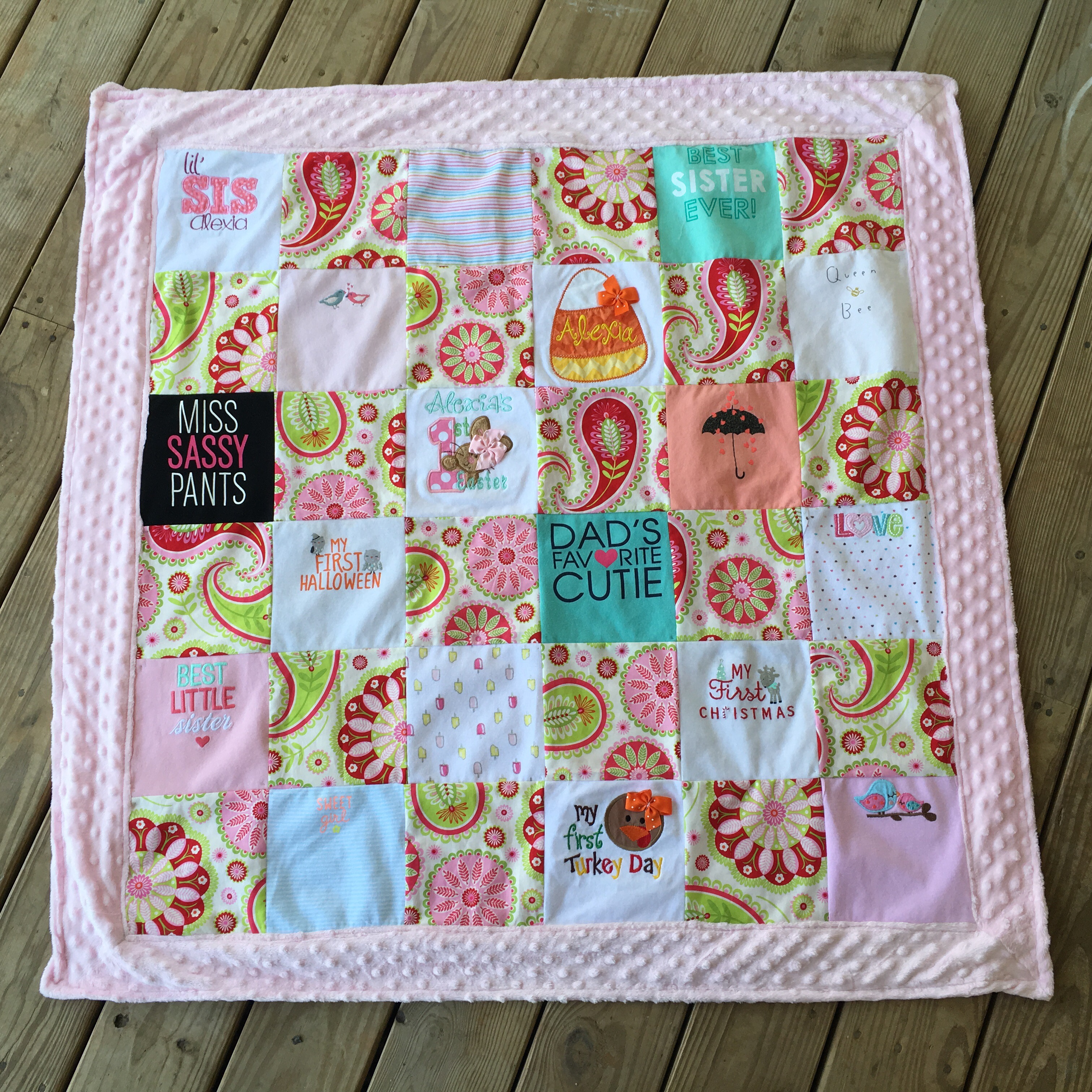 - I charge $15 a shirt, making a quilt with 9 shirts $135, a quilt with 12 shirts $180, 16 shirts is $240 and 20 shirts is $300. I am able to embroider a name or date on a square or on the back for an additional charge. If you’d like pockets incorporated either as corners or as a block on the quilt, that is $10 each. For quilts using infant or children’s clothing, prices start at $7 per shirt.