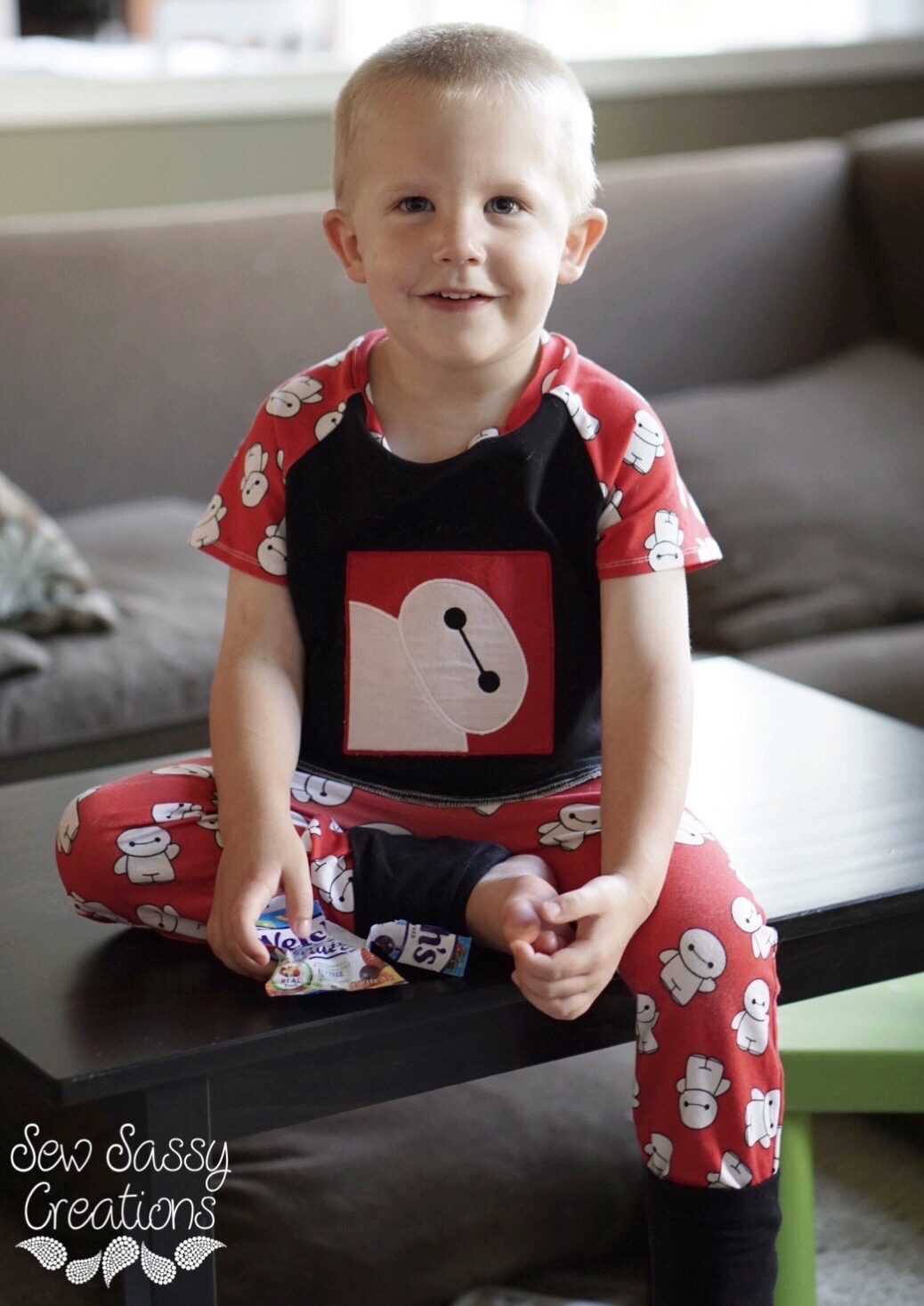 The next morning, I was going through my stash of knit fabrics, and Zac saw my Up fabric. He was pointing out the balloons and characters and he asked me to make him a shirt. How could I say no to that? Zac always gets excited when I make him outfits or pajamas out of character fabrics, but I think this is the first time he specifically asked for something. I got right to work.