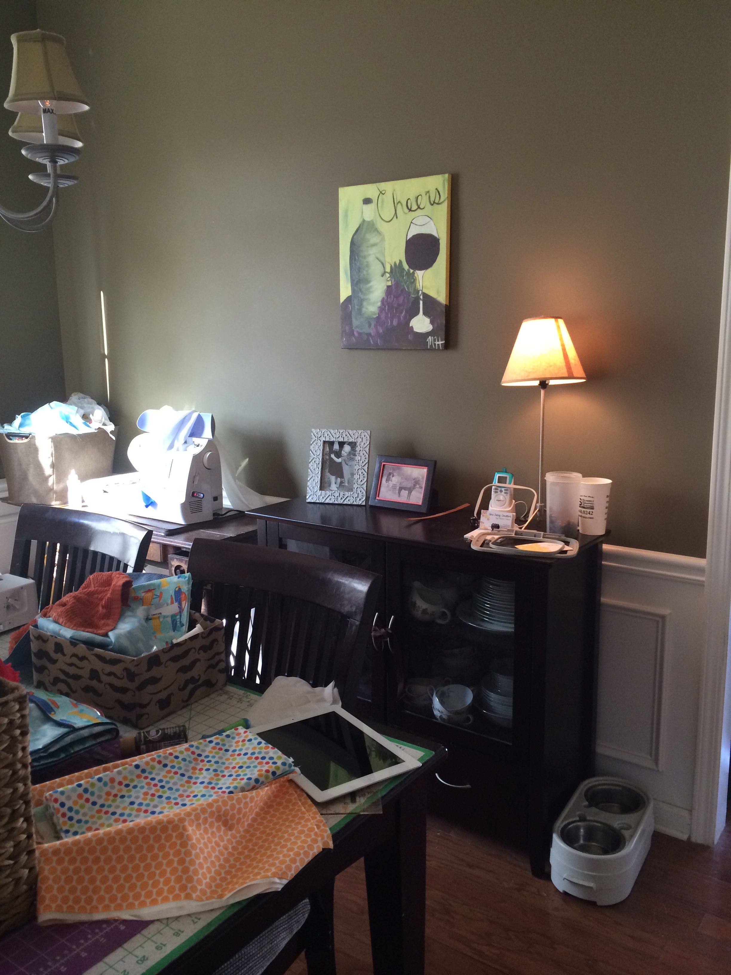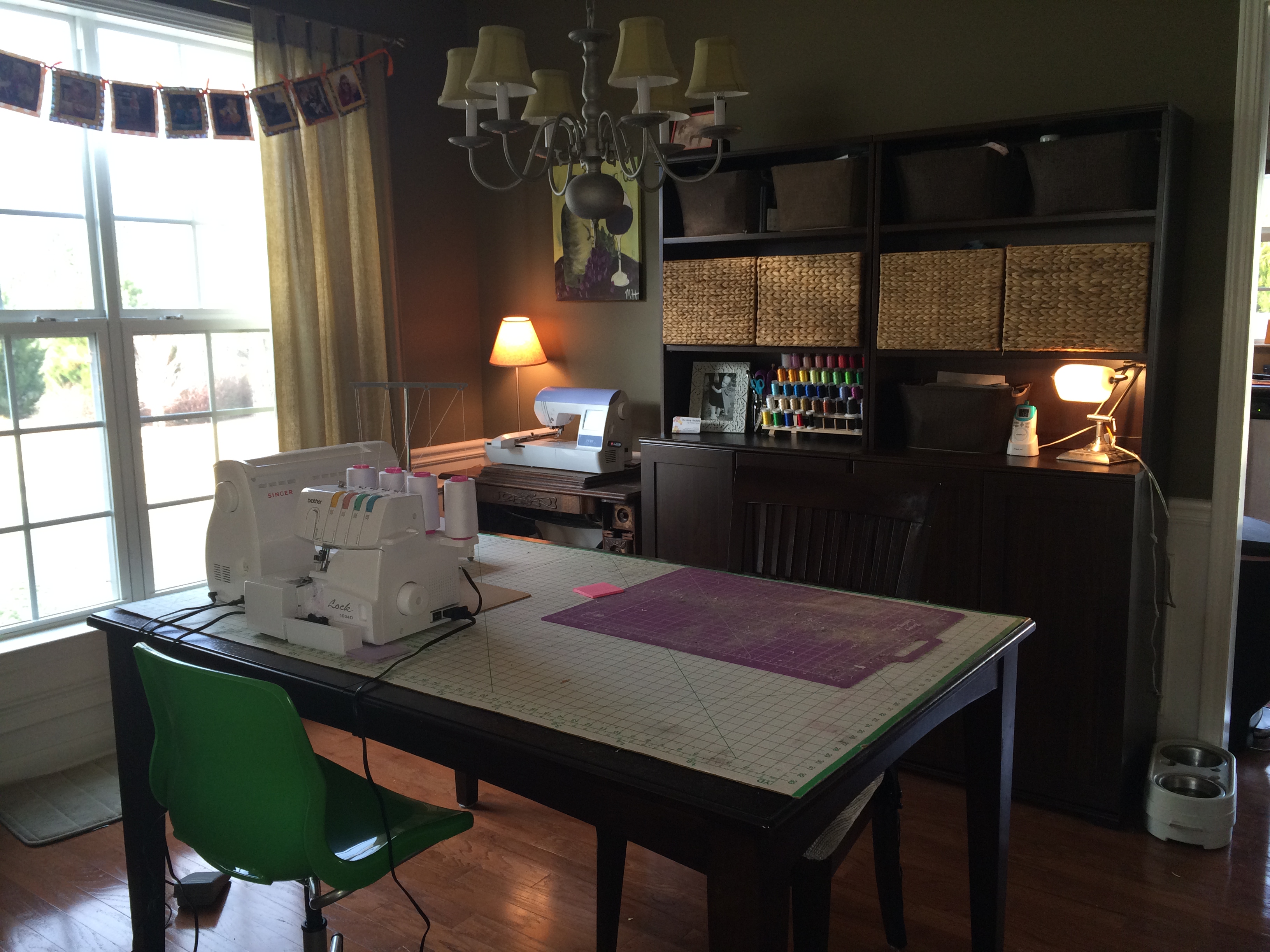This picture was snapped walking through the door. My favorite thing in this room is the butcher block island (purchased from Ikea) that I use as a cutting table. It’s 35.5″ high, making it perfect for cutting fabric and piecing patterns.