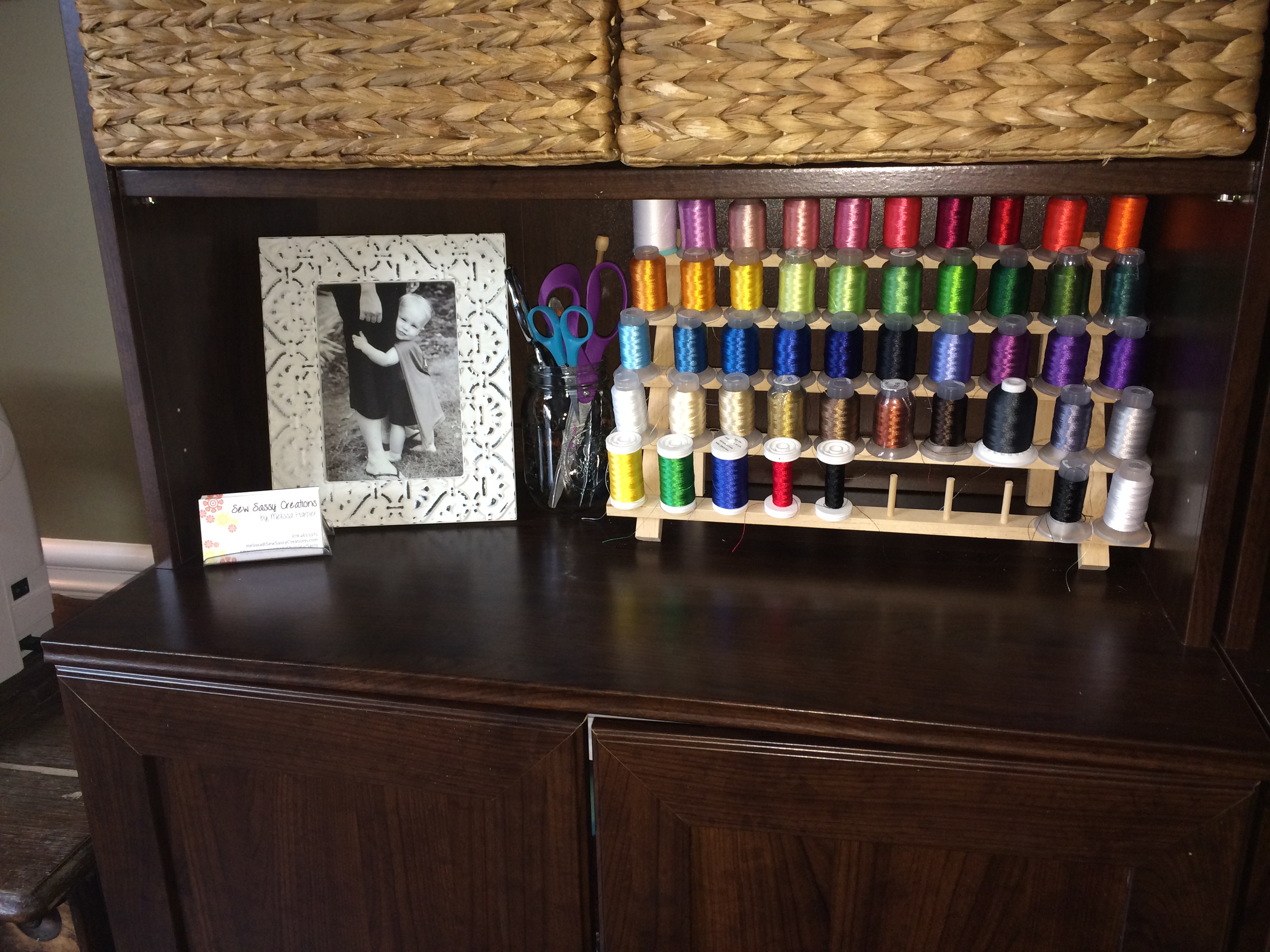 Here’s a peek inside the closet. I have fabric stored in the bins at the bottom, although I’d love to come up with a better storage solution. I added shelves to accommodate my silhouette cameo, and beside that is my backup singer sewing machine.